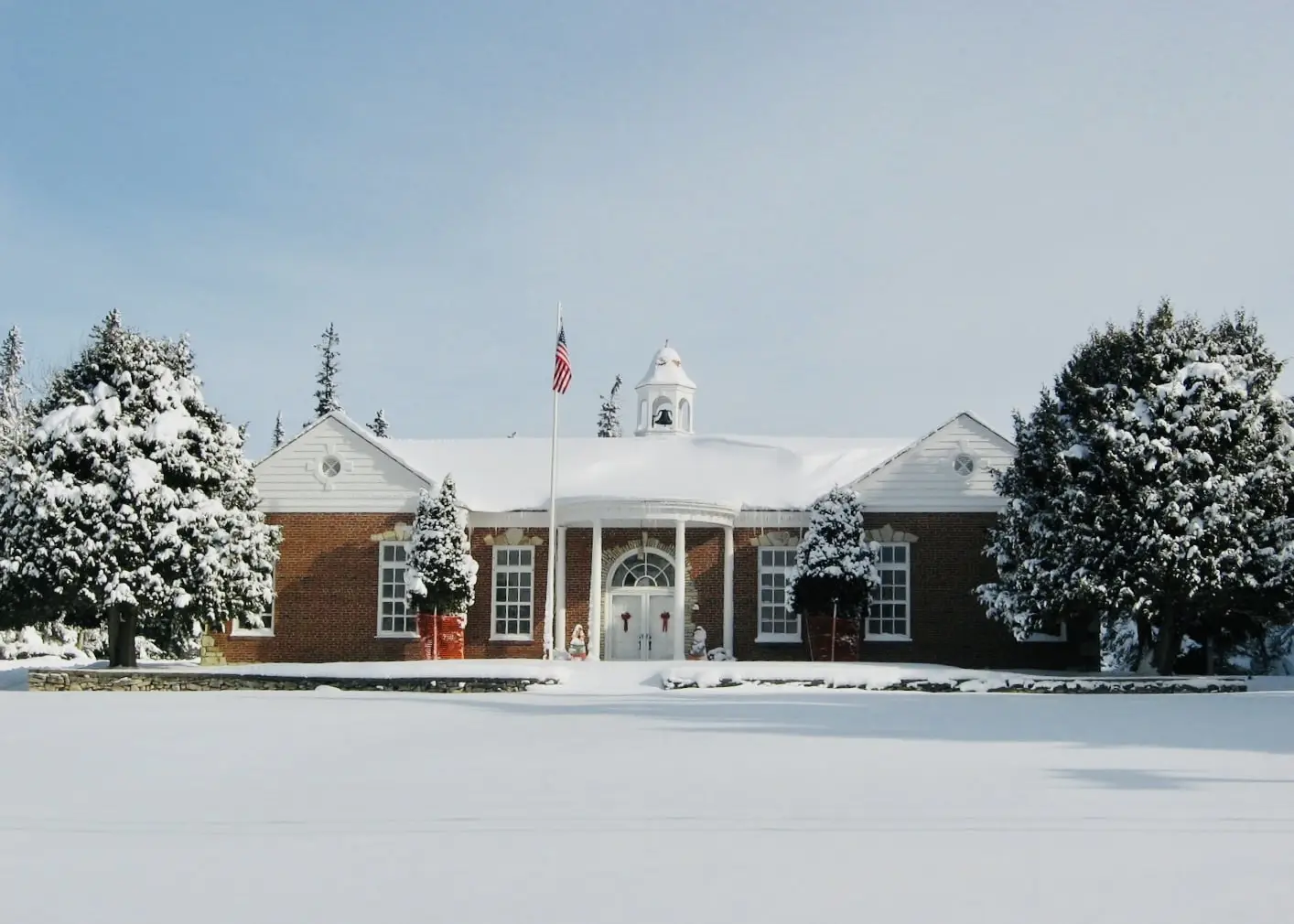 The Hessel School House was built in 1937 through the Works Progress Administration (WPA) and welcomed its first students in September of 1938. Of handsome brick and stone Georgian architecture and completely symmetrical in design, it housed grades kindergarten through fifth in two classrooms, with the central part of the building featuring a large, multi-purpose room to serve as an auditorium (with a stage and its side entry), lunchroom, and gymnasium. The building was steam heated and beautifully located near the former wooden framed school (see photo on left).