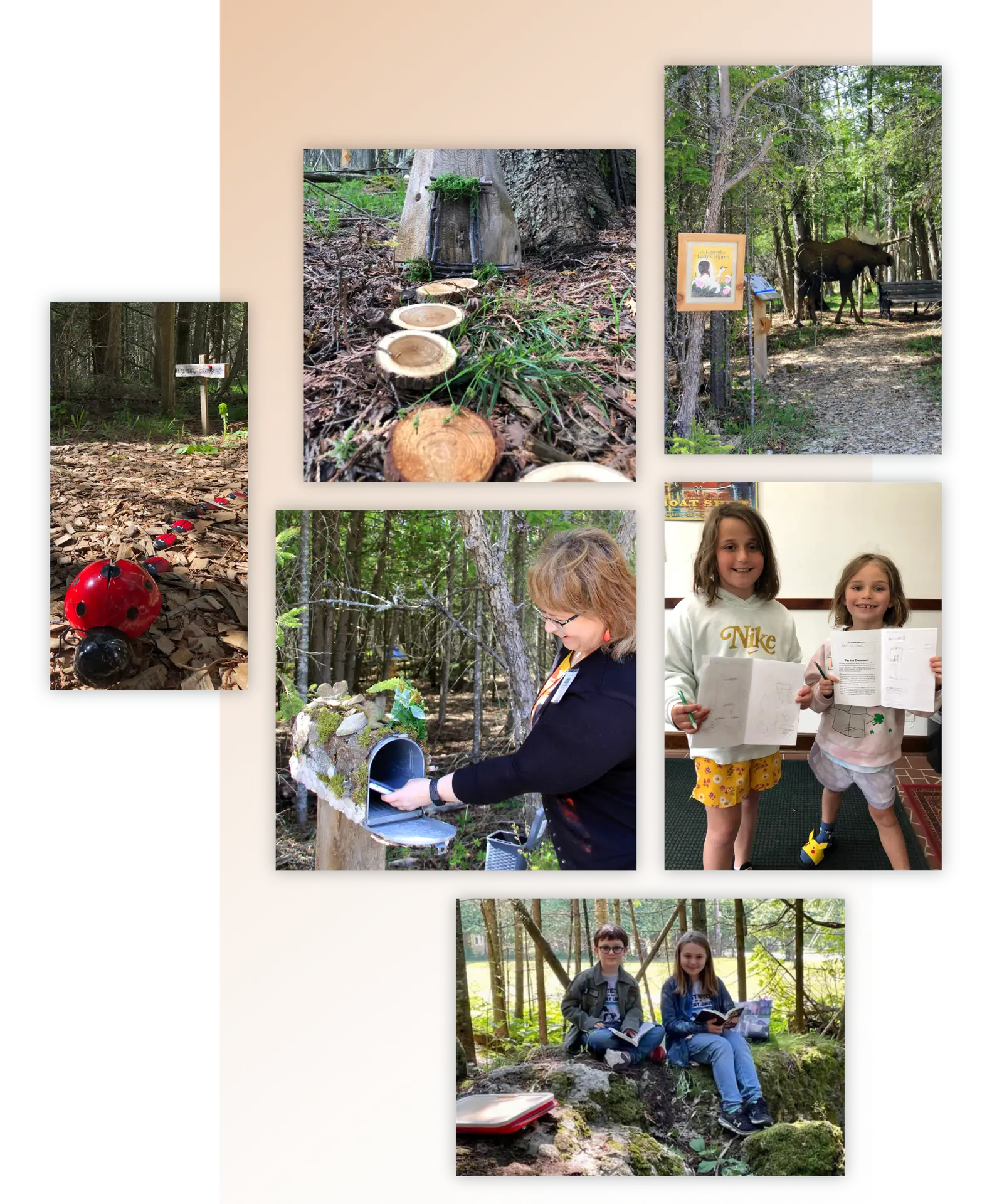 In the spring of 2021, a group of Hessel School House volunteers and staff built an 18-station storybook trail. It is primarily geared to 5- to 9-year-olds but has large appeal for all ages. The storybook trail winds through the wooded area immediately west of the historic schoolhouse, where its former students once played imaginative games and built tree forts during the late 1930s through the 1950s. Today, children of all ages are greeted by a large moose and bench at the beginning of the trail.